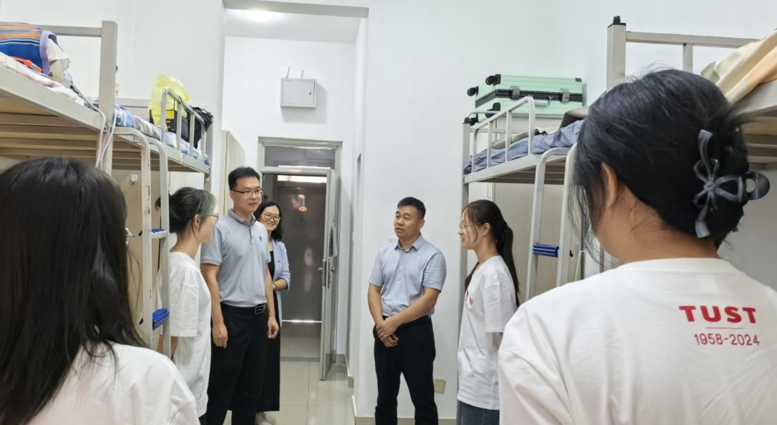 党委书记杜岩刚、副书记李红亮及新生辅导员们一道前往新生宿舍走访慰问,具体了解新生家庭情况、食住适应情况、目前遇到什么困难等问题;叮嘱新生要相互包容、相互帮助,尽快适应大学校园生活;提醒新生警惕新型网络、电话诈骗等,确保新生财产安全;勉励新生珍惜大学时光,学会自主学习,做好大学生涯规划,坚持刻苦学习,注重实践锻炼,争取全面成长成才。