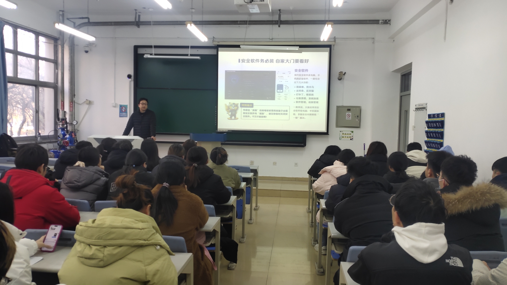 陈磊老师首先讲解了网络安全的重要性,指出网络带来了便利,同时也伴随着各种风险,如网络诈骗、个人信息泄露、网络欺凌等。希望同学们增强网络安全意识,学会如何防范网络风险。随后,陈磊老师就正确安装和使用杀毒软件,做好电脑日常查杀维护;数据传输过程中可能出现的安全风险及防护;密码安全的必要性和注意事项;如何识别和防范电信欺诈等内容进行了详细讲解。