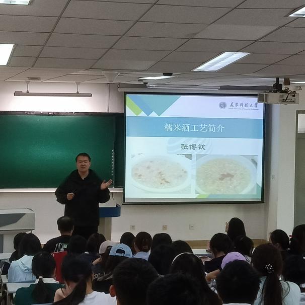 现代酿造技术研究团队张博钦老师从专业的角度,以“糯米酒工艺简介”为题进行讲解。张老师从原料选择、蒸煮工艺、酒曲活化、发酵条件控制、状态监测与适时终止等环节展开讲解,强调发酵过程的密封性、无菌操作、发酵时间等对风味形成的关键作用。最后,张老师鼓励同学们拓展思路、发挥创意,酿出“糯米酒+”的不同风味糯米酒。
