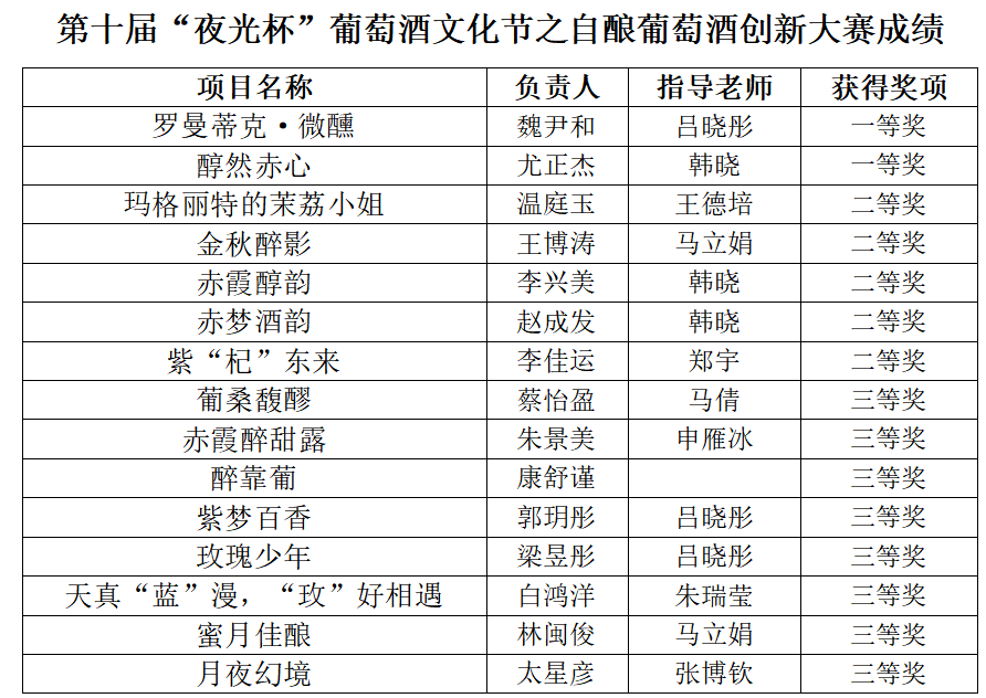 “夜光杯”自酿葡萄酒创新大赛已成功走过十届历程,累计有1200余支团队、4500余名同学积极参与其中。这一赛事不仅成为了学校传承与弘扬中华优秀传统文化的重要载体,也为提升大学生人文素养、培养创新精神和实践能力提供了广阔的平台。多年来,它见证了无数学生在葡萄酒文化领域的成长与探索,培养了一批又一批对葡萄酒文化充满热情的学子。相信在未来,这一赛事将继续发扬光大,不断创新和完善赛事形式与内容,吸引更多师生投身于葡萄酒文化的探索与实践。