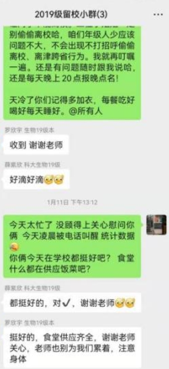 寒假留校学生基数大的实际情况,成立了以党委为领导的留校学生管理工作小组,深入学生宿舍开展调研,了解同学们留校期间的身心状况、科研情况及生活困难,把解决思想问题、心理问题与解决实际问题紧密结合,学生反馈的相关问题已得到极大改善;2018级本科生辅导员申莉面向留校学生开展8次集体辅导和单独谈心谈话,辅导内容围绕合理规划留校时间、前置毕业设计/论文安排、生涯规划、求职等方面,并对申请留校的10名本科生进行“云家访”,创建留校学生家长微信交流群,随时与学生和家长进行沟通,让留校学生放心,让留校学生家长放心;针对留校的斯里兰卡留学生,通过“结对子”,对留学生进行精准帮扶,帮学生解决语言沟通、无身份证登记核酸检测信息等问题。