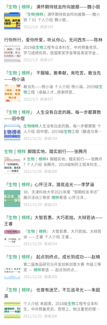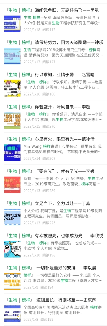 先后面向全院学生开展榜样教育、安全教育、防诈骗教育、职业规划、心理疏导等系列教育活动,放假不放松,始终将对学生的陪伴、守护和引导放在第一位。20余篇身边的榜样事迹,纵向覆盖大一至研三,篇篇可参考,件件可学习;生物战“疫”说系列推文,将安全教育、防诈骗教育、身边的志愿者事迹广而告之,引导学生提高安全意识、自我防护意识,也鼓励学生主动抗“疫”、承担责任、发光发热。