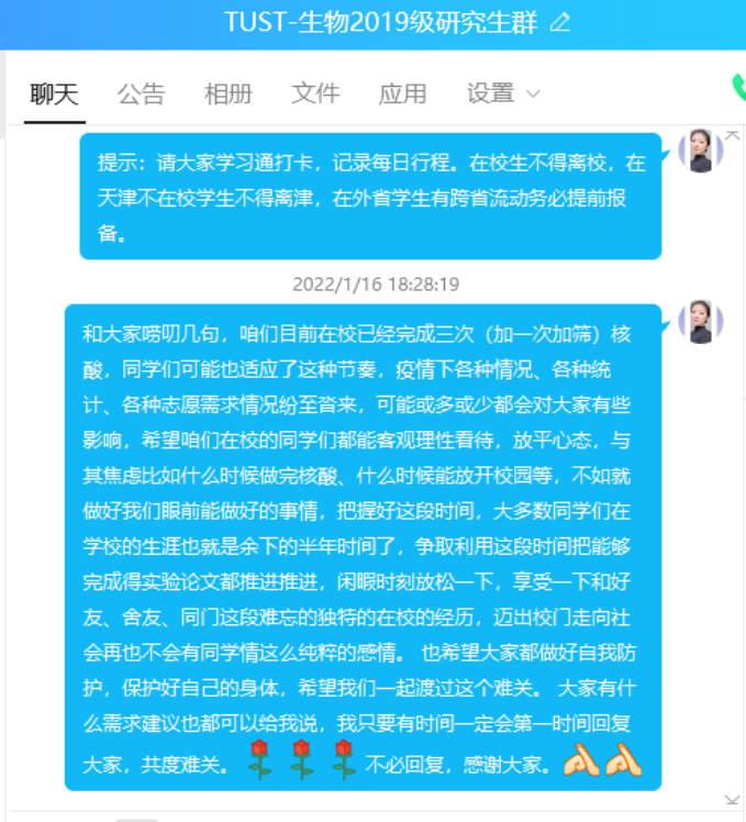 密切掌握学生健康情况、思想动态以及出行情况等,坚持自上而下协同联动,坚持点对点及时沟通、一对一精准施策。1月10日上午,在接到23日及之后离津学生重点排查工作后,各年级有序调动班委力量,逐一排查并向涉及学生传达属地报告及核酸检测要求,8小时内做到了底数清情况明;1月11日凌晨,在接到进一步排查学生防疫数据的通知后,草莓视频