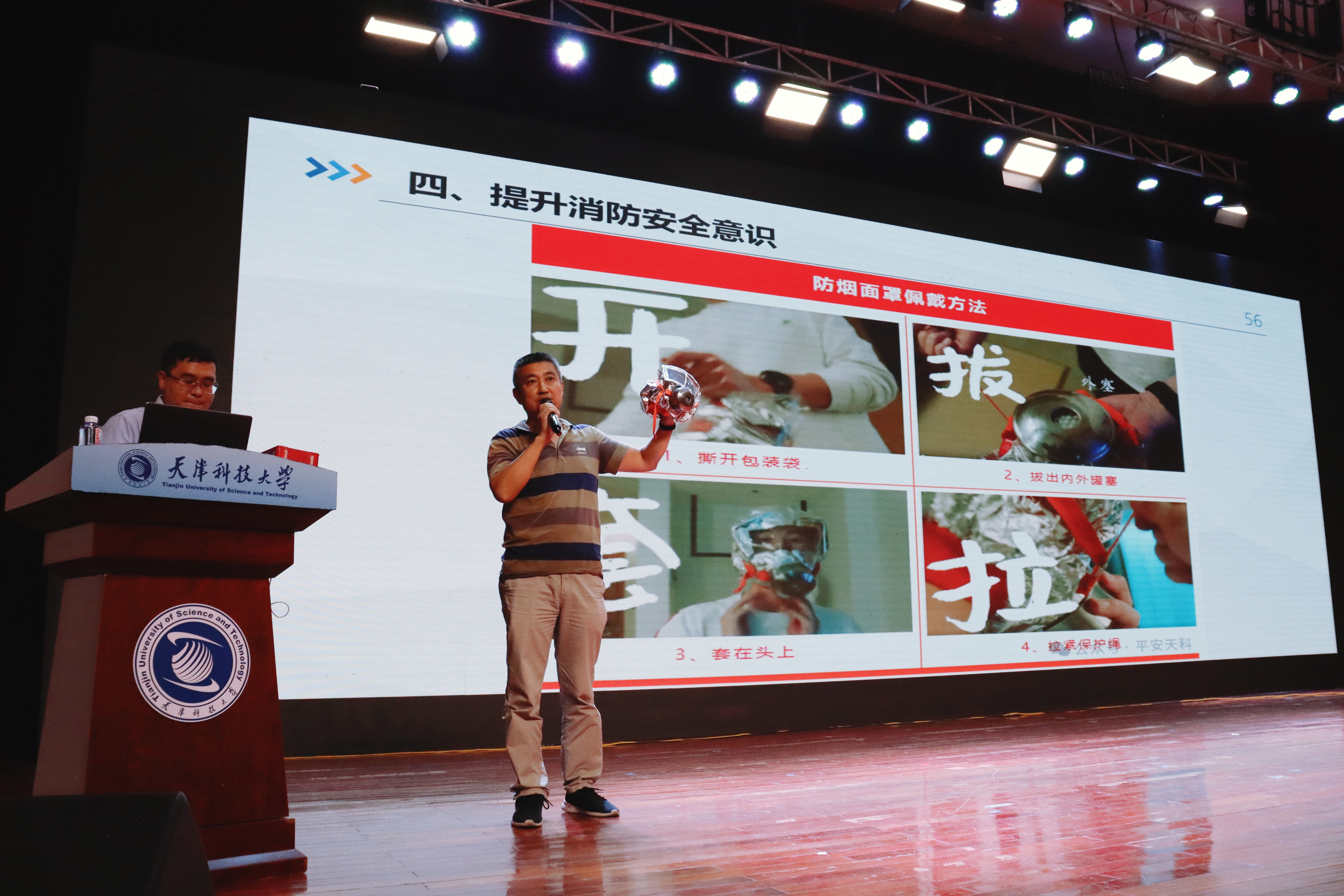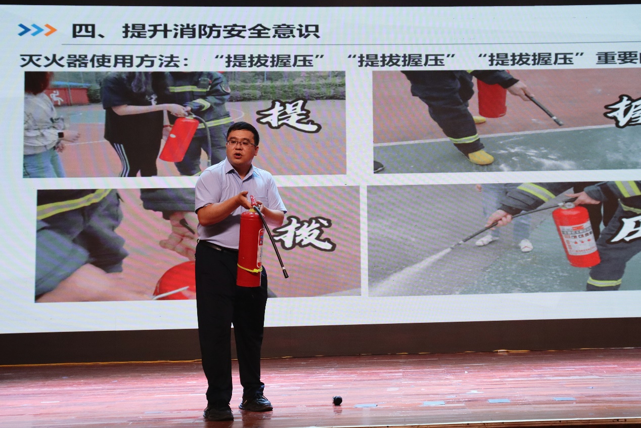 邀请了保卫处王悦科长带来一场生动详实的消防安全教育讲座。他结合高校实验室火灾案例,深入剖析火灾发生的原因及危害,详细讲解了灭火器、消防栓等消防设施的使用方法以及火灾预防措施。保卫处孙家平老师现场示范了“过滤式消防自救呼吸器”和灭火毯的使用方法。两位老师通过现场演示与互动问答,强化了同学们的安全意识,直观掌握火灾逃生技巧,有效提升了大家应对突发火情的能力。