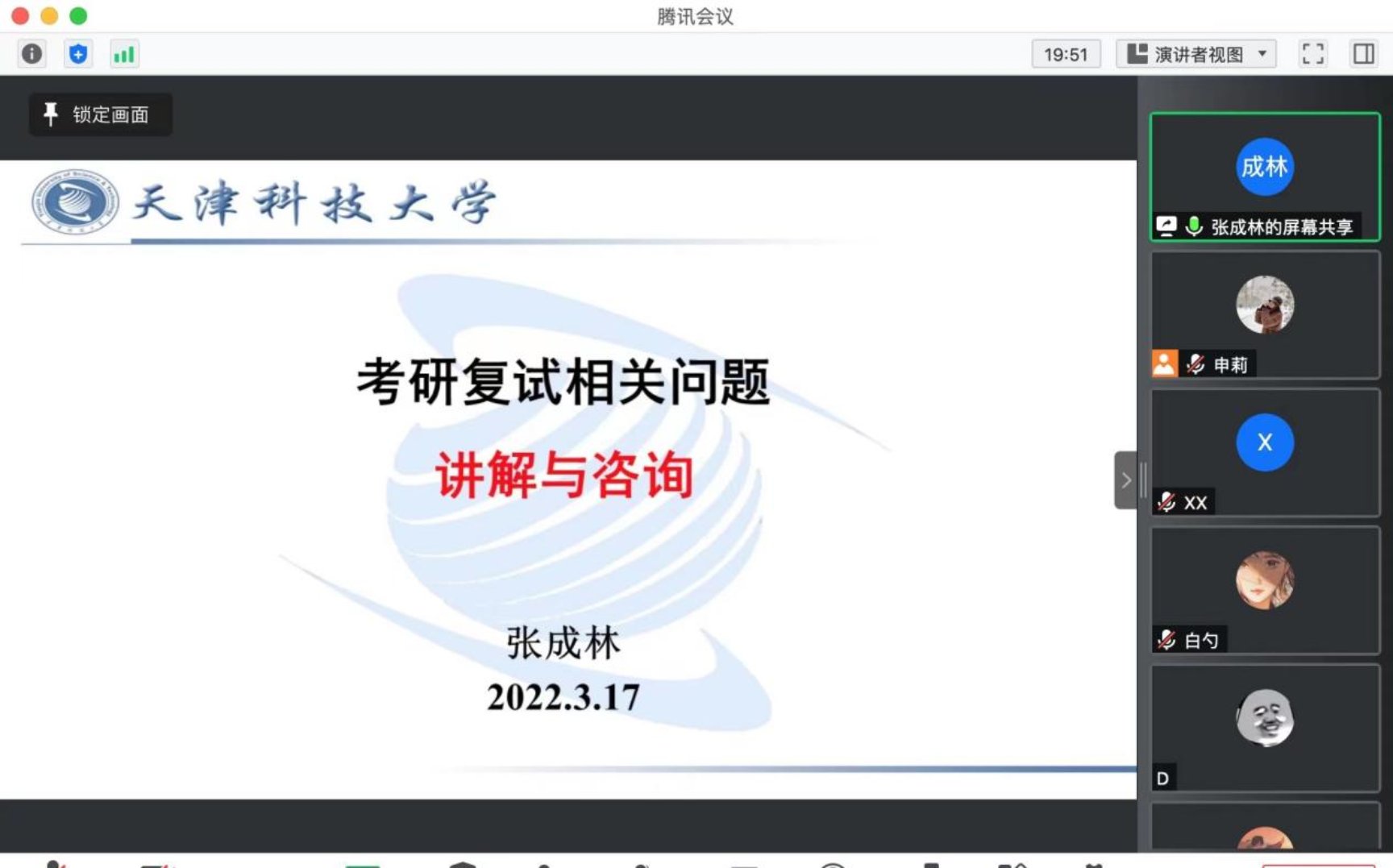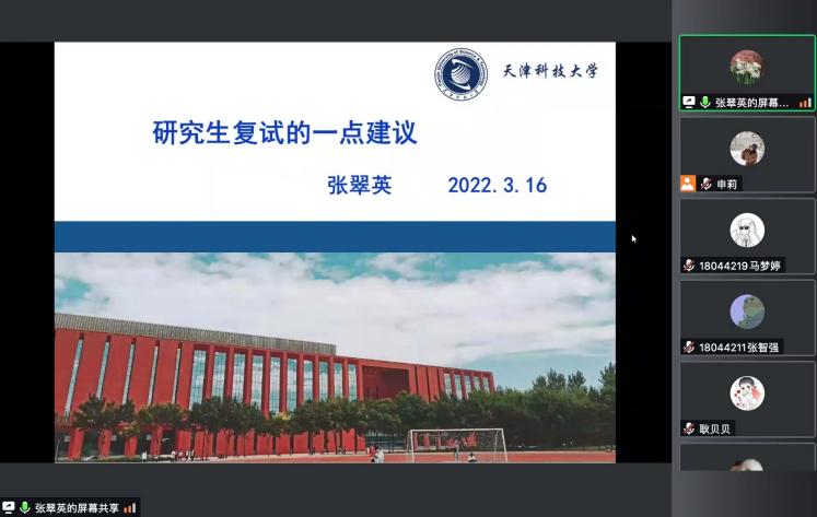 授予学位点情况、教学情况、立体健全的研究生学位建设情况进行了详细介绍,并从认识复试、准备复试和复试过程三个层面给出自己的建议。张成林教授从研究生导师和复试面试官的角度出发,从目前的任务、复试注意事项及技巧、如何选择导师三个方面做了深入细致的分享,并对同学们在复试过程中能够锦上添花的高亮部分进行解释和点拨。王巨克老师针对今年线上复试的形式给学生们介绍了网络复试准备相关内容。