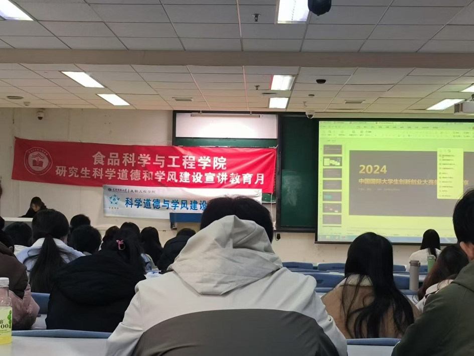 联合举办了2024年研究生科学道德与学风建设月主题系列宣讲活动。在第九讲中特别邀请到中国国际大学生创新大赛(2024)天津赛区高校主赛道金奖获得者罗虹同学,与同学们分享她的竞赛学习经验和科研感悟。