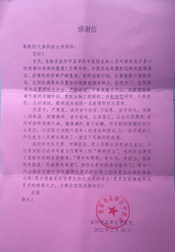 近日,宝坻区疫情防控指挥部、洛阳市孟津区中医院向草莓视频发来感谢信,信中对草莓视频