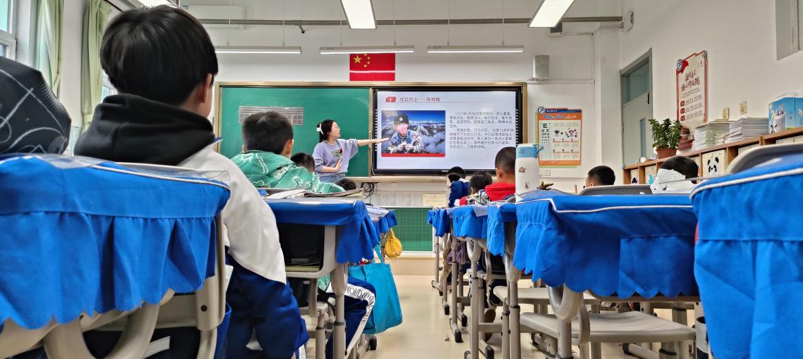 课后服务志愿者2021级本科生王子桢以生动的语言和视频讲述了“清澈的爱,只为中国”戍边英雄陈祥榕的故事,“巍峨的喀喇昆仑山脉,绵亘于我国新疆南部。群山中的加勒万河谷被称作“生命禁区”,可在驻守的边防官兵心中,始终拥有坚定的信念:我站立的地方是中国,我要用热血和生命去捍卫脚下的每一寸土地。对英雄故事的讲述,既是知识课,也是人生课,是对英雄的礼敬,是爱国主义教育的映照,更是一次次心灵的播种,在课堂中学习他们的付出,从英雄的事迹中汲取营养与力量,让青少年真切感受到和平来之不易,明白何为牺牲、奉献,明白为何要努力学习、奋发向上,将爱国情转化为强国志、报国行。